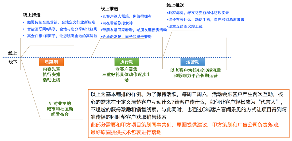 相对来说,以业主为核心抓手,投入资源聚焦,线上线下结合相对便利,效果方便监控,符合互联网+的最佳实践,如果通过社区核心业主的社交营销传播效应,对销售和品牌将均有强大促进、推广。借助客户助力,在售项目及其他业务版块的传播推广和拓客到访。通过项目和城市的微信平台促成老客户的关注和回归,以丰富多彩的圈层活动、全⽅位的价值传递、及时传达在售项目信息和多种形式的社区互动活动,增进与客户之间的⻓期粘性,拓宽金地自在城自有可控的私域流量和影响力共享平台。
